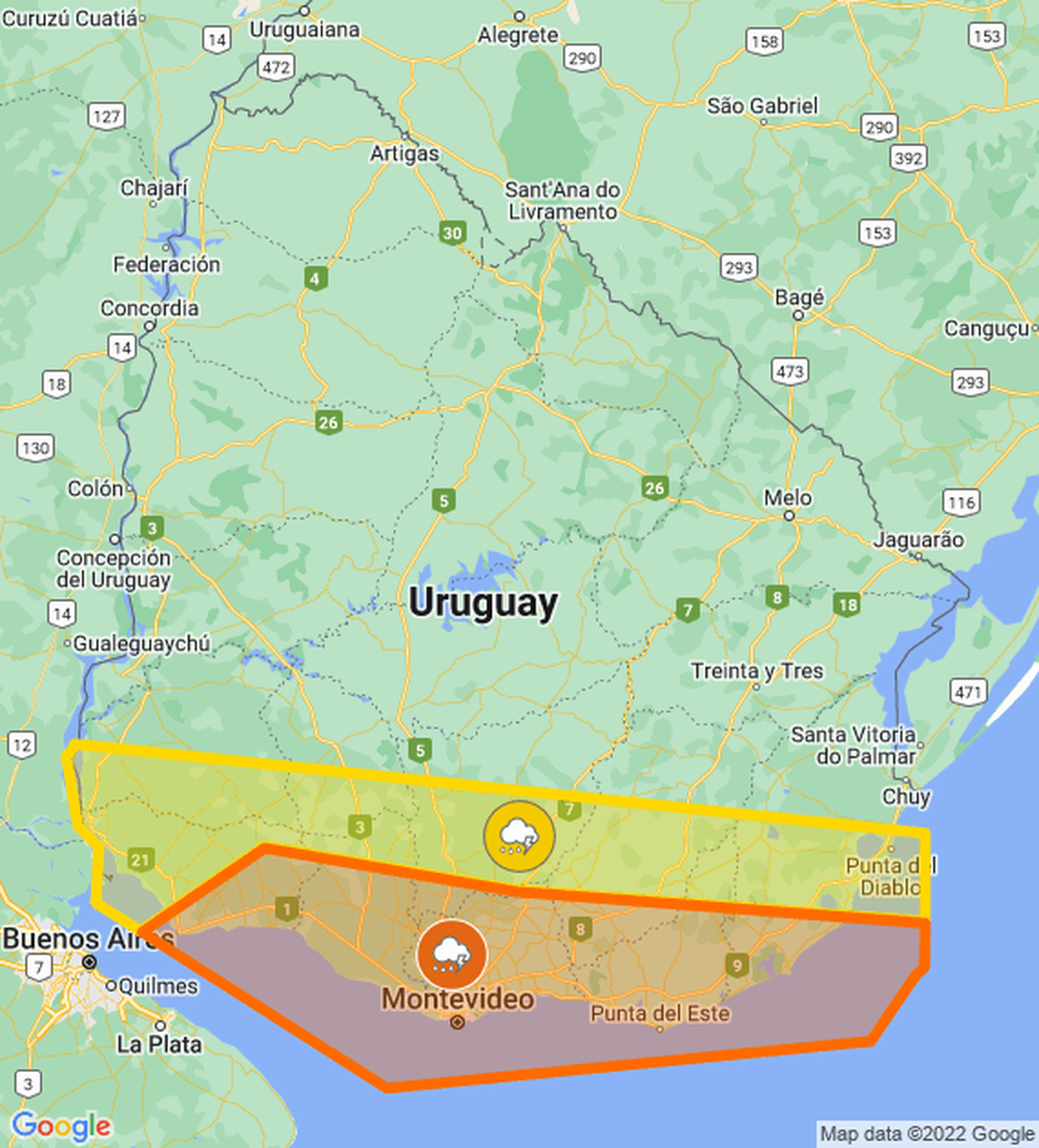 Meteorología emitió alerta naranja y amarilla por tormentas fuertes y lluvias intensas para algunos departamentos del sur del país.