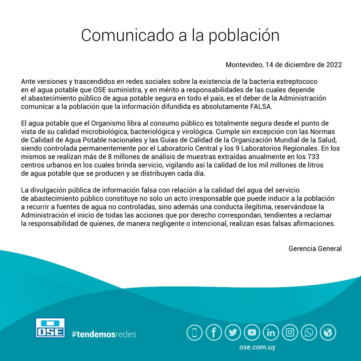 OSE, por su parte, comunicó que el agua “es totalmente segura” y sostiene que la información que circula en el audio viral es “irresponsable” y “una conducta ilegítima” por lo que la Administración se reserva “el inicio de todas las acciones que por derecho correspondan” por las “falsas afirmaciones”.