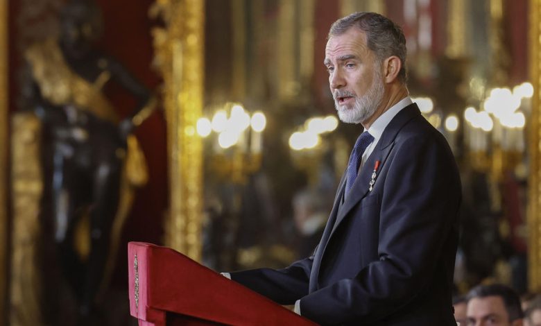 Felipe VI, acompañado por la reina Letizia, se refirió a América Latina en una recepción ofrecida al cuerpo diplomático en Madrid, a la que asistieron el presidente del Gobierno español, Pedro Sánchez, el ministro de Asuntos Exteriores de España, José Manuel Albares, y más de un centenar de embajadores y representantes de organismos multilaterales.