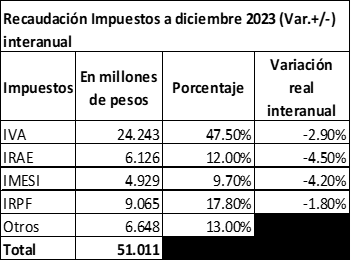 En cuanto al mes de Diciembre 2023 específicamente y de los impuestos principales, después del IVA (24.243 mill.), el IRPF (9.065 mill.) fue el segundo impuesto con mayor recaudación, seguido del IRAE (6.126 mill.) y el IMESI (4.929 mill.).