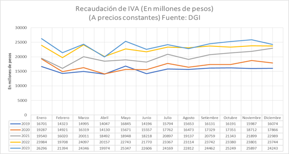 La comparativa de la recaudación de IVA 2023 con respecto al 2022 nos muestra a las claras que prácticamente no hubo meses extraordinarios en cuanto a la recaudación, de esta manera la recaudación de IVA como uno de los indicadores de la actividad económica, manifiesta que el 2023 fue un año con muchas dificultades con poco o nulo crecimiento.