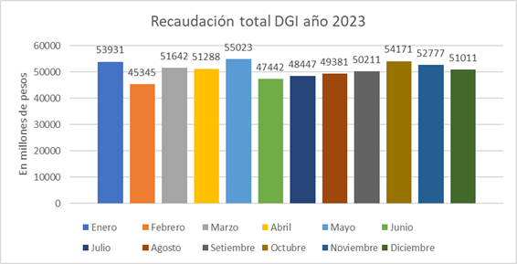 En total durante el 2023 la recaudación total por concepto de impuestos alcanzó los 610.669 millones de pesos, siendo el mes de Mayo el mejor de 12 meses con una recaudación de 55.023 millones, en tanto el mes de menor recaudación del 2023 se produjo en febrero con tan solo 45.345 millones.