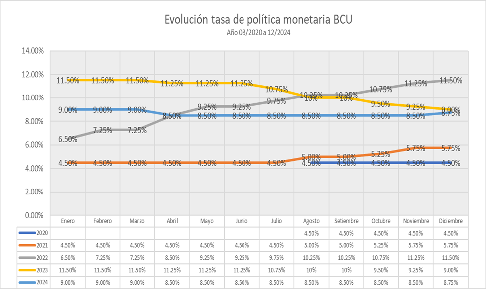 Al igual que mucho de los Bancos Centrales a nivel mundial el BCU elevó las tasas de política monetaria con la intención de reducir la inflación, esta última se elevó en forma considerable a causa de la inestabilidad económica global generada a partir del escenario de pandemia e inmediato posterior.