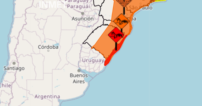 El organismo emitió una advertencia de “gran peligro”, sobre todo, para el estado de Río Grande del Sur que comparte frontera con departamentos uruguayos como parte de Rocha, Cerro Largo y Rivera.