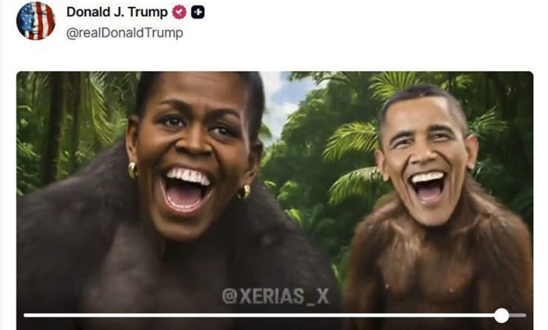 El corte racista que se burla de los Obama se muestra en el último segundo del video compartido por el presidente en Truth Social y aparenta haber sido creado por un usuario de Instagram (xerias_x) que produce videos mediante inteligencia